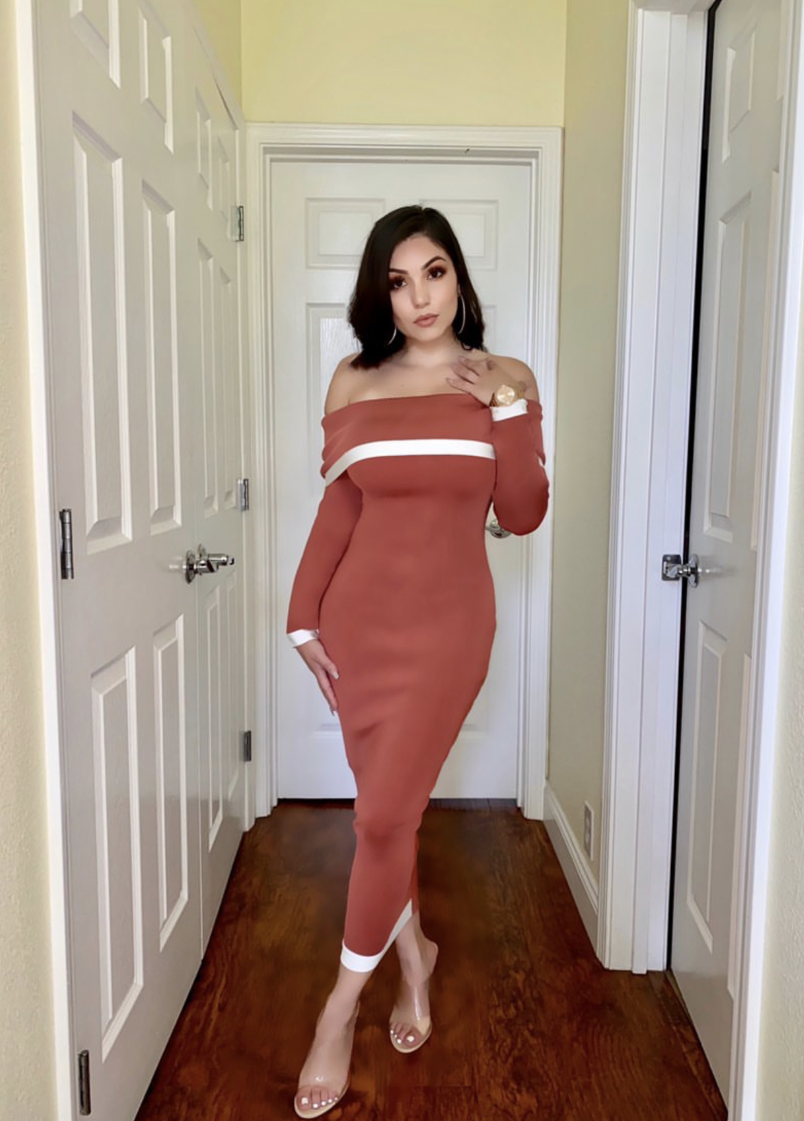 Brown knee length off the shoulder bandage dress.